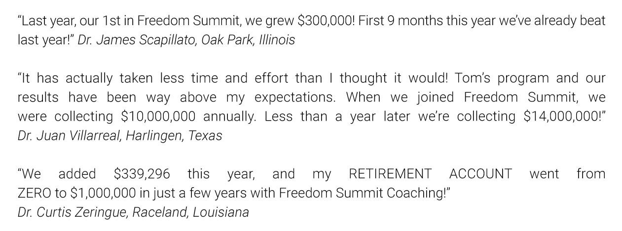Over the last 20 years Elizabeth and I have made Freedom Summit (aka GG12) Coaching available for dentists who demonstrate their commitment to serving your patients at the highest level, creating an environment where team members thrive, and a level of practice that rewards you with the Financial Freedom to live the life and lifestyle about which you have only dreamed.